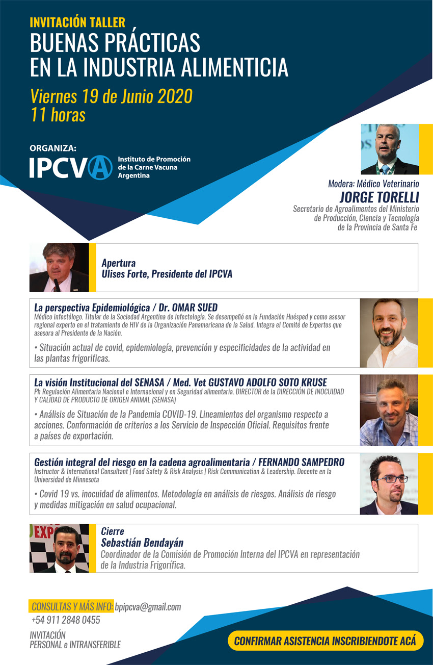 El próximo viernes 19 de junio el Instituto de Promoción de la Carne Vacuna Argentina (IPCVA) llevará adelante un nuevo taller online. A partir de las 11:00 y vía streaming, un panel de especialistas y destacados profesionales compartirán sus conocimientos y experiencias sobre "Buenas Prácticas en la Industria Alimenticia".