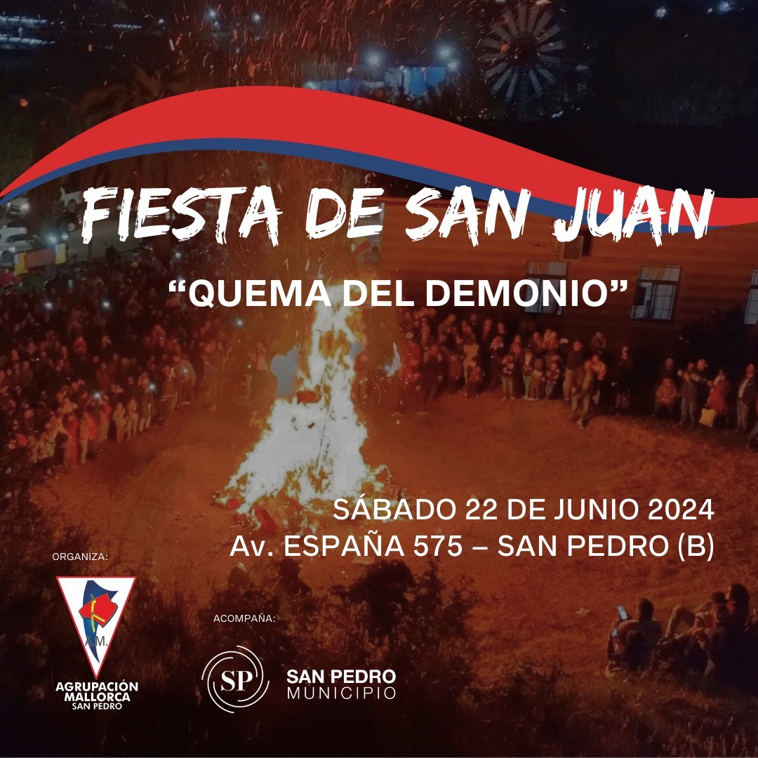 Desde la Secretaría de Cultura, Turismo, Educación y Deportes, compartimos la invitación a una de las fiestas más características del calendario sampedrino: la nueva edición de la Fiesta de San Juan con la tradicional 'Quema del Demonio', organizada por la Agrupación Mallorca y la Municipalidad de San Pedro.